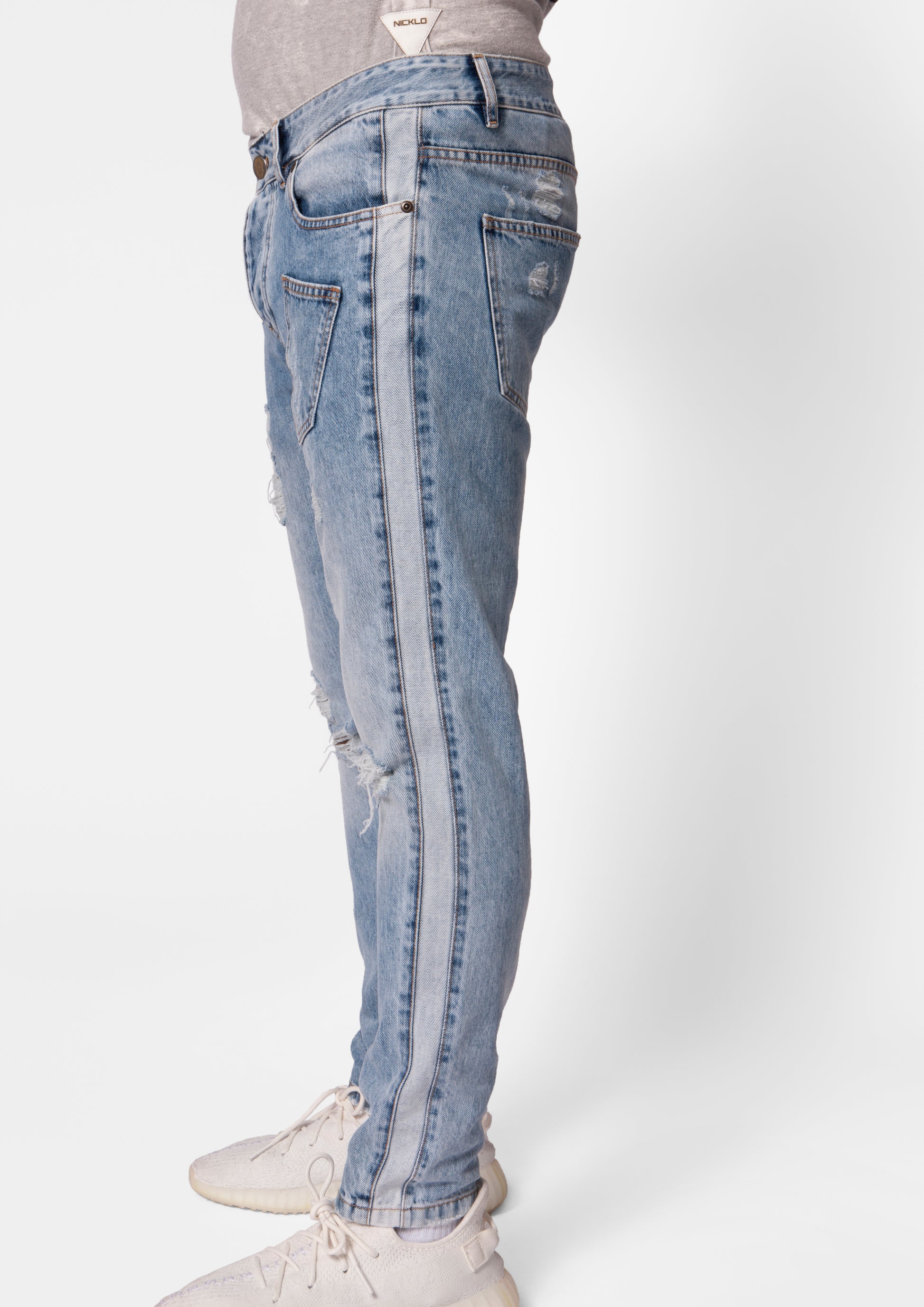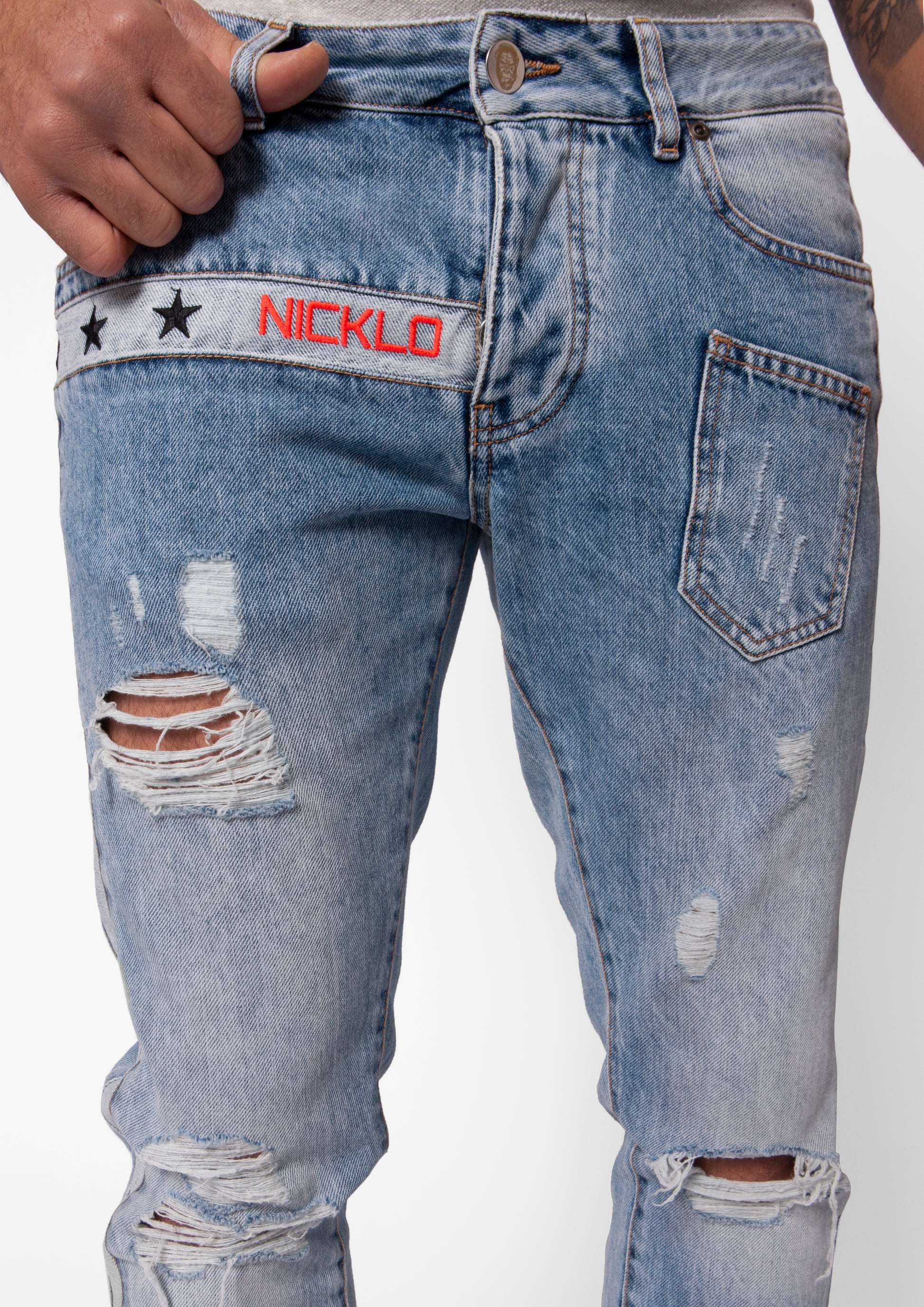 Description: Blue stone washed distressed slim fit jeans with embroidered electric colour Nicklo logo, embroidered black stars running from the front to the back and zippers at the ankles.